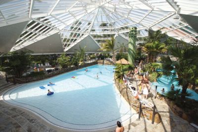 Ein Highlight vom Südsee-Camp ist das subtropische Badeparadies mit Wellenbad, Wildwasserkanal, Familienrutsche, Piratenschiff und Kleinstkinderbecken. Sauna, Solarium als auch die Kontiki-Bar vervollständigen das Angebot. Bei 31° Wassertemperatur, blühendem Hibiskus und Bananen lässt es sich wunderbar toben und relaxen.